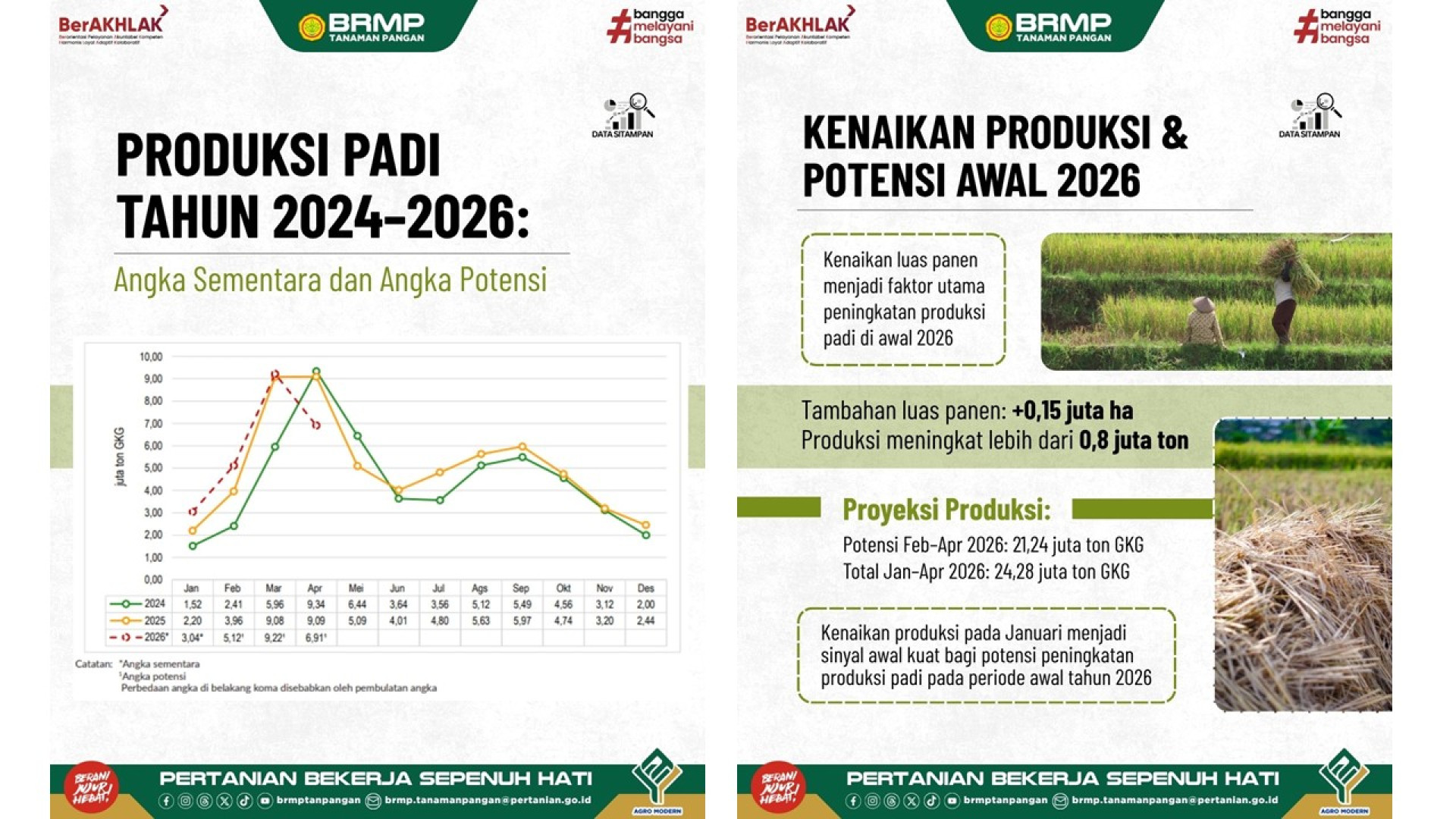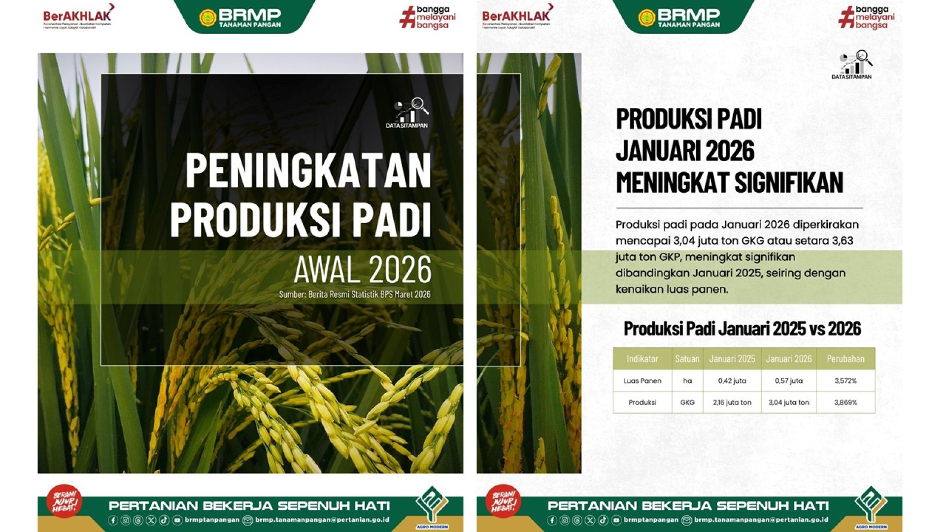 Produksi padi Januari 2026 diperkirakan mencapai 3,04 juta ton GKG (setara 3,63 juta ton GKP), meningkat signifikan dibanding Januari 2025 seiring kenaikan luas panen 35,72%